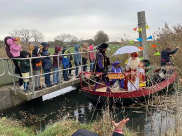 Ondanks het slechte weer waren de kinderen, ouders, opa’s en oma’s in grote getale naar de Stoeiing gekomen om Sinterklaas welkom te heten.