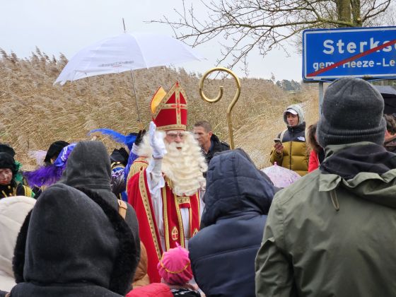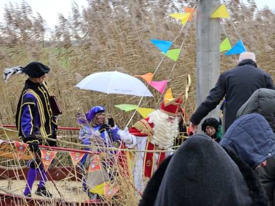 Met hulp van de acrobatische Pieten kon de Sint toch heelhuids bij de steiger uitstappen. Na een kort welkom voor Sinterklaas van de aanwezige kinderen, werd er snel richting dorpshuis de Valentijn gelopen.