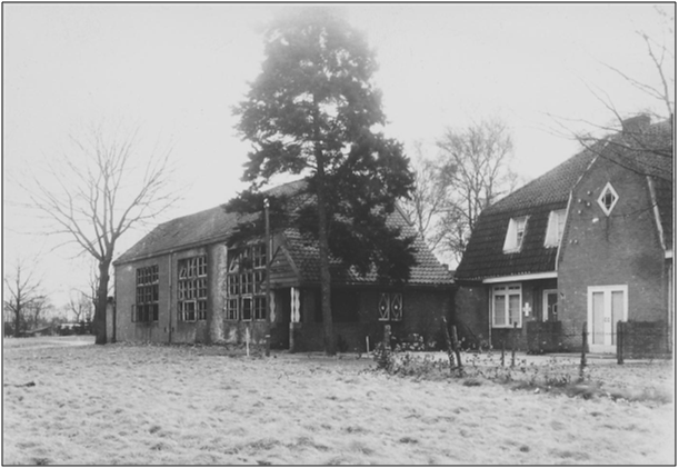 Oude leegstaande school lichtelijk vernield. Rechts voormalige woning hoofd der school